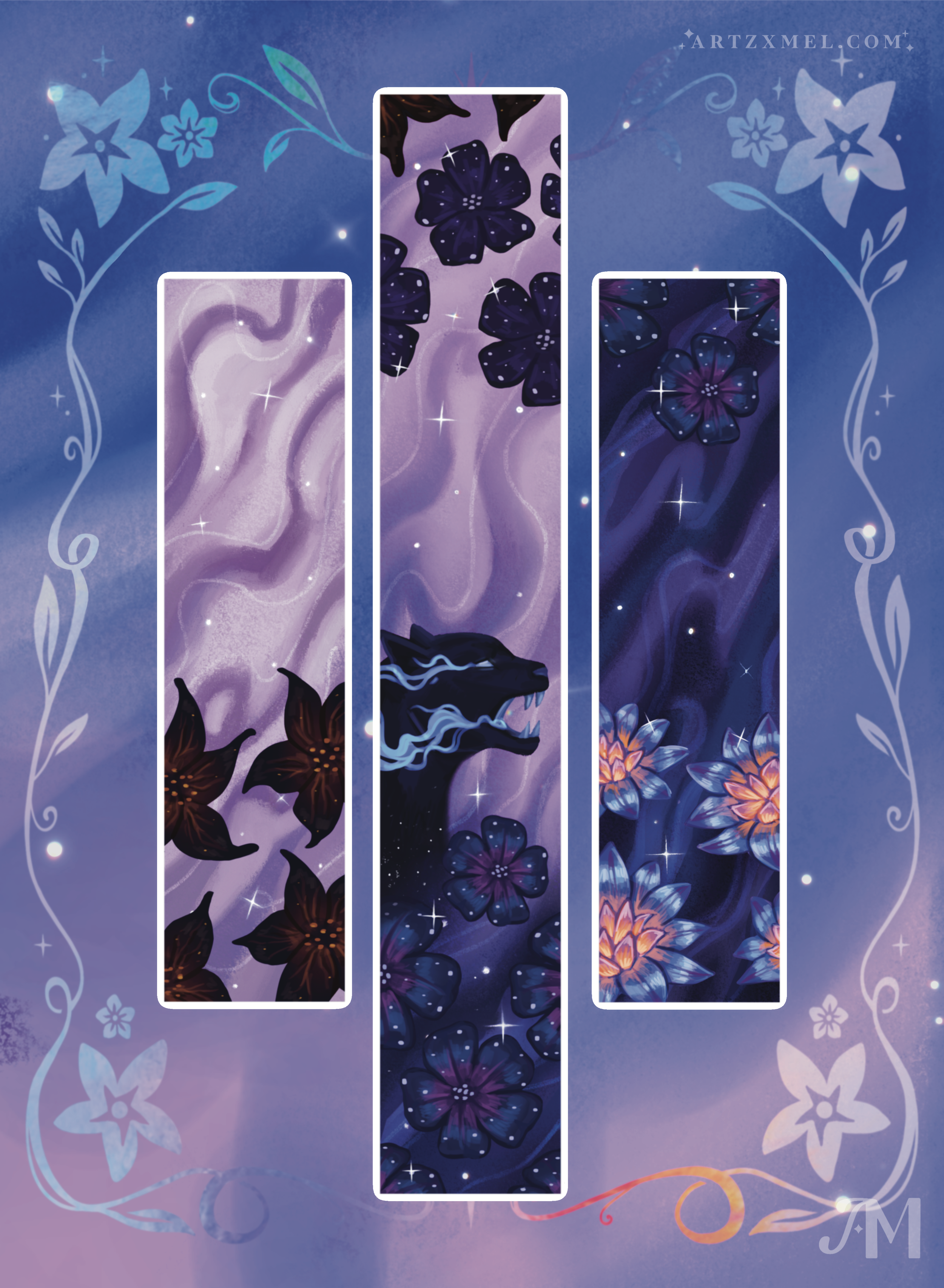 To complete the special edition look, I illustrated all three sprayed edges, incorporating the same floral elements, a starry backdrop, and the shadow panther centered on the middle edge for a cohesive finish.