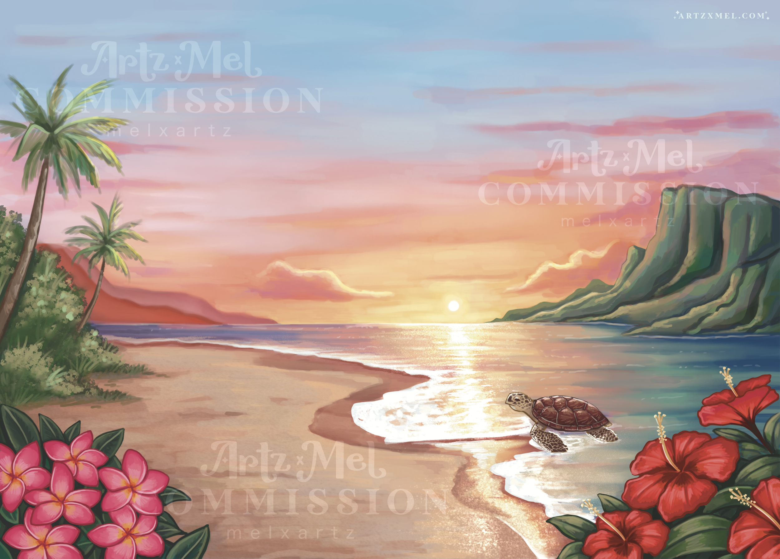 I approached this piece with a focus on atmosphere and color harmony, balancing soft pinks, oranges, and purples to evoke the gentle calm of a Hawaiian evening. The warm lighting and painterly details were chosen to transport the viewer into that quiet, magical moment where the sun meets the sea.