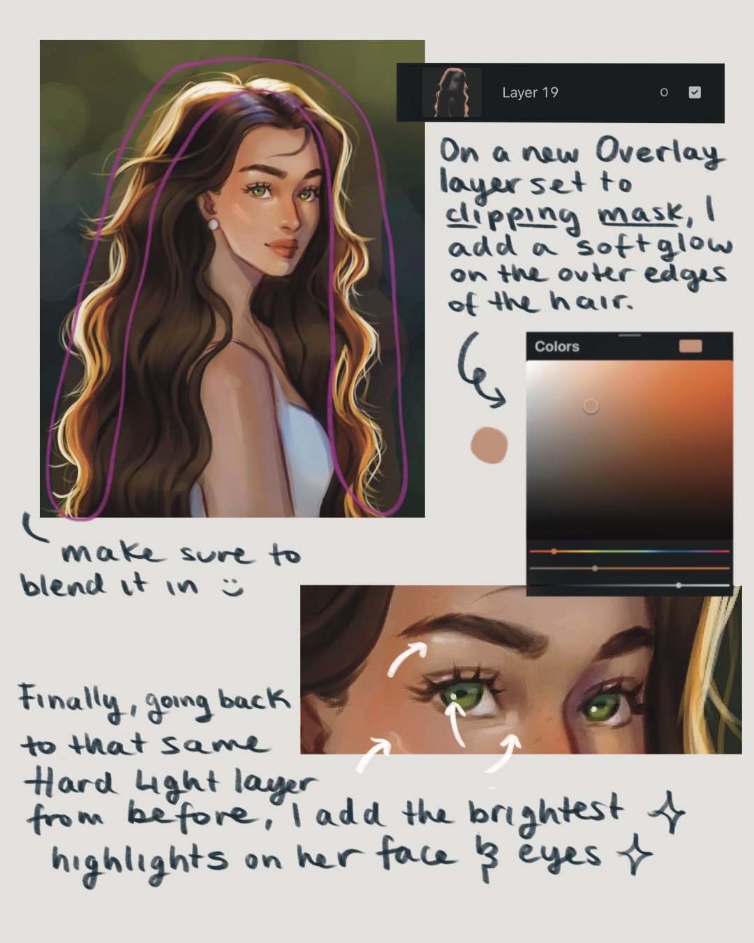 On a new Overlay layer placed beneath your highlights, softly brush around the hair using a warm orange tone. This gives that sunlit haze and softens transitions between the light and shadow.
