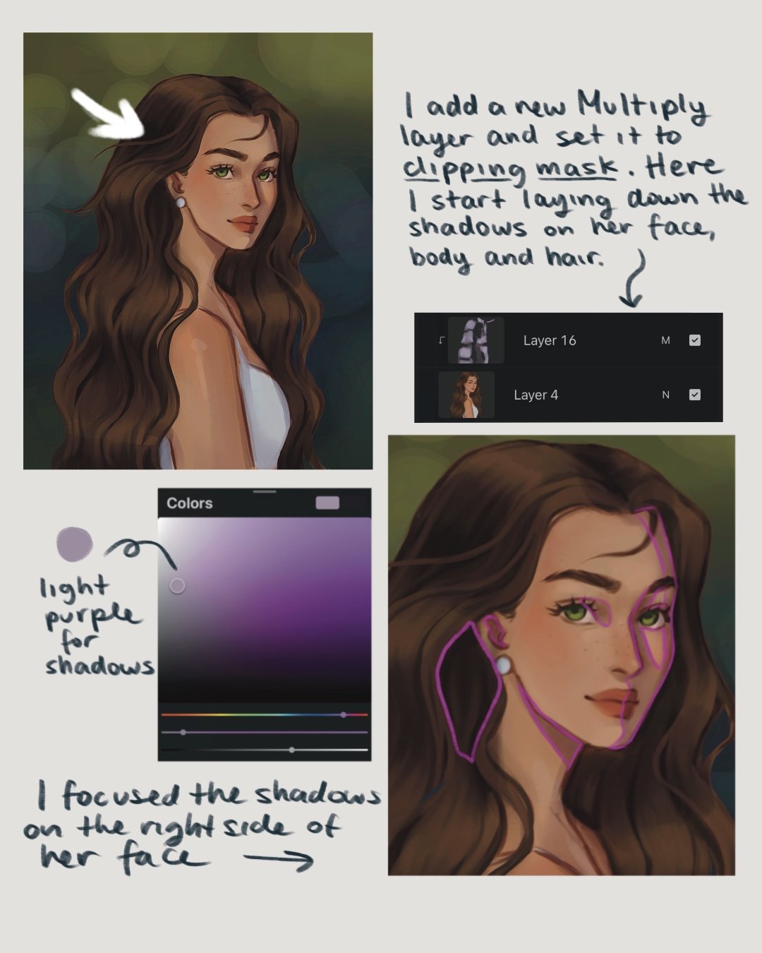 Create a new Multiply layer and set it to Clipping Mask, here softly darken the areas away from the sun β for me, that was the right side of her face.